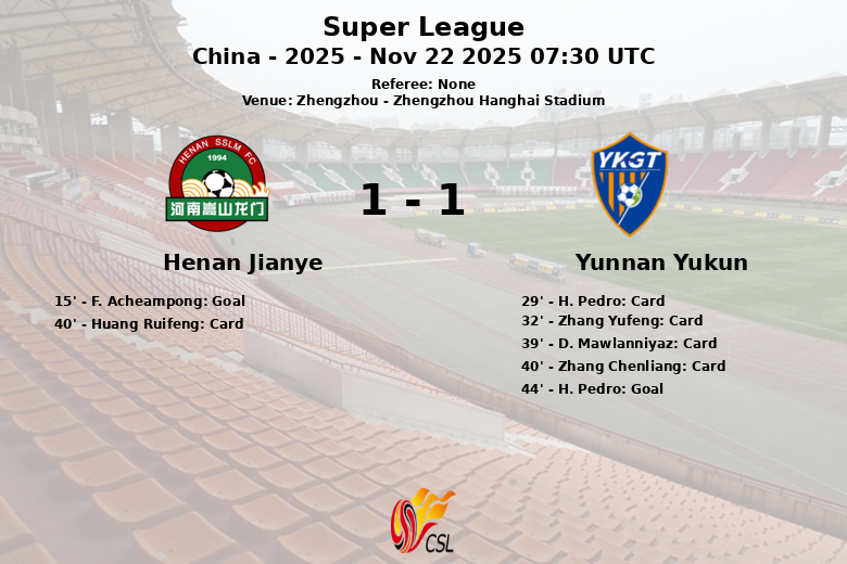 The first half was peppered with yellow cards, especially for Yunnan Yukun, who accumulated four cautions. Huang Ruifeng also received a yellow card for Henan Jianye. Just before halftime, H. Pedro equalized for Yunnan Yukun in the 44th minute, taking the game into the break level.
