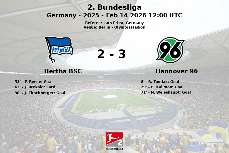Berlin witnessed a vibrant match at the Olympiastadion, where Hannover 96 defeated Hertha BSC in an action-packed 2. Bundesliga game. Hannover 96 took an early lead with a goal from B. Tomiak in the 8th minute, assisted by E. Leopold. They extended their lead in the 29th minute thanks to B. Kallman, assisted by D. Yokota.