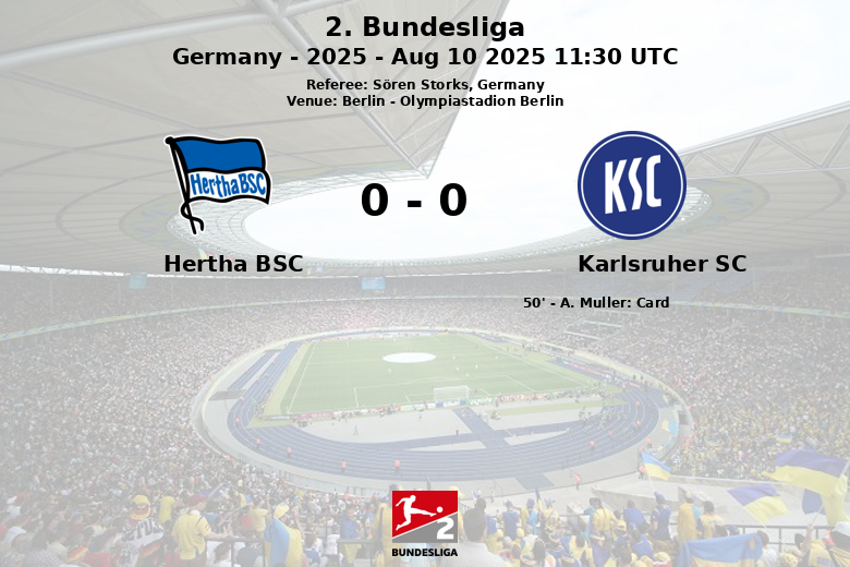 Karlsruher SC, on the other hand, showed more aggressiveness in attack, with 18 total shots, although with similar accuracy, only 2 of them directed towards the opponent’s goal, and 10 went wide. The away team managed to obtain 10 corners, demonstrating their persistence in the Hertha’s area. The only disciplinary incident of the match was a yellow card shown to A. Muller of Karlsruher SC in the 50th minute. Referee Sören Storks was in charge of maintaining order in the match.