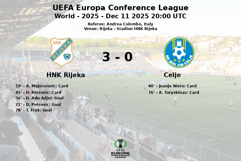 Rijeka, December 11, 2025 – HNK Rijeka dominated their match against Celje at the Stadion HNK Rijeka, corresponding to the fifth matchday of the UEFA Europa Conference League group stage. The match, officiated by Italian referee Andrea Colombo, ended with a favorable score of 3 to 0 for the home team.
