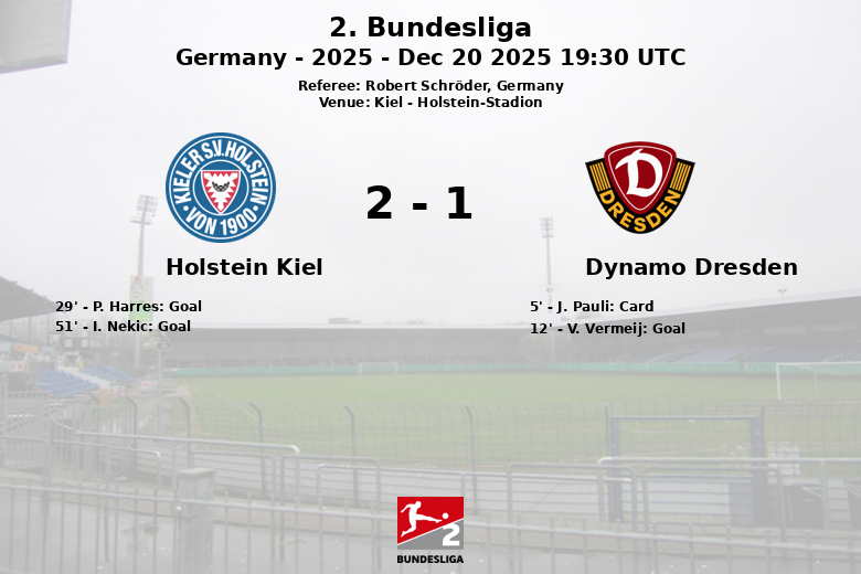 Kiel, Germany – Holstein Kiel defeated Dynamo Dresden in an exciting 2. Bundesliga match played at the Holstein-Stadion. Despite a promising start for Dynamo Dresden, who took the lead in the 12th minute with a goal from V. Vermeij assisted by L. Herrmann, Kiel showed character and determination to turn the game around.