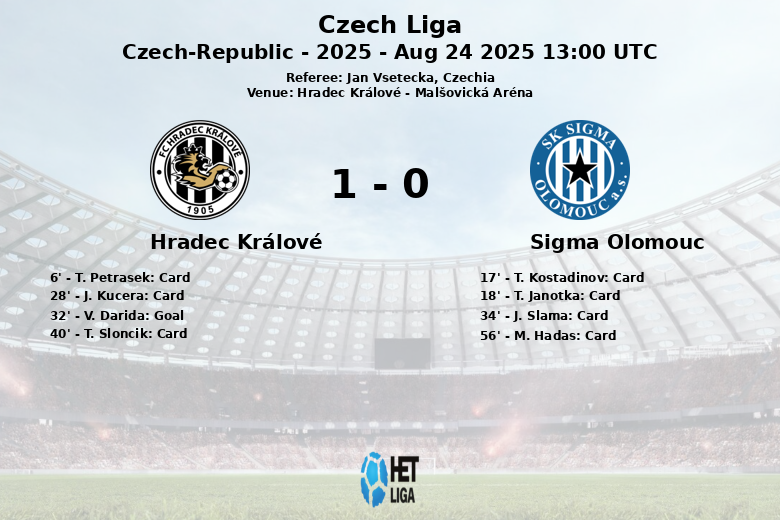 Hradec Králové, August 24, 2025 – Hradec Králové triumphed over Sigma Olomouc at home in a hard-fought match at the Malšovická Aréna, in the 6th round of the Czech Liga. The only goal of the game was scored by V. Darida in the 32nd minute, assisted by D. Horak, securing the victory for his team.