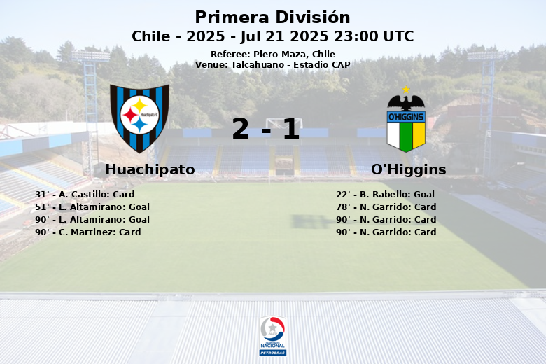 O’Higgins took the lead in the 22nd minute thanks to a goal by B. Rabello, assisted by R. Godoy, unleashing joy in the visiting fans. However, Huachipato did not give up and, after a hard-fought first half, found the equalizer in the 51st minute through a penalty converted by L. Altamirano.