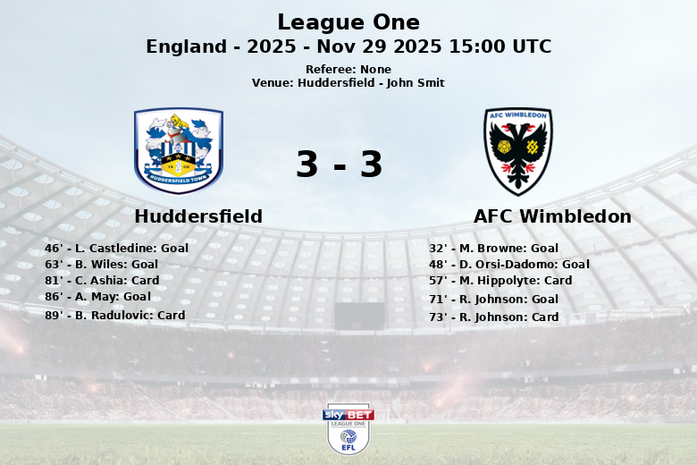AFC Wimbledon initially surprised with a goal from M. Browne in the 32nd minute, assisted by S. Seddon. However, Huddersfield reacted quickly in the second half. L. Castledine equalized in the 46th minute, assisted by C. Ashia. Shortly after, D. Orsi-Dadomo put AFC Wimbledon ahead again in the 48th minute. The game continued at a frenetic pace, and B. Wiles scored for Huddersfield in the 63rd minute, with an assist from L. Gooch. R. Johnson extended the lead for the visitors in the 71st minute, assisted by J. Reeves. In the final minutes, A. May scored for Huddersfield in the 86th minute, sealing the final draw.