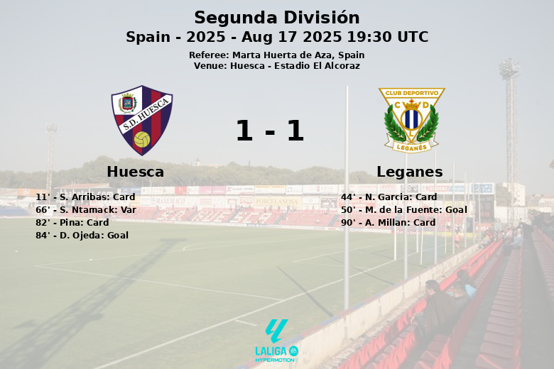 After the restart, Leganés took the lead in the 50th minute thanks to a goal by Miguel de la Fuente, assisted by D. Garcia. Huesca did not give up and sought the equalizer with insistence. In the 66th minute, a goal by S. Ntamack was disallowed by VAR due to an offside. Huesca continued to press and found their reward in the 84th minute, when D. Ojeda, assisted by A. Carrillo, leveled the score. In the final minutes, Pina of Huesca received a yellow card in the 82nd minute, and A. Millán of Leganés saw it in the 90th minute. Despite Huesca’s territorial dominance, with 56% possession compared to Leganés’s 44%, and a greater number of shots (14 compared to 6), Leganés knew how to take advantage of their opportunities.