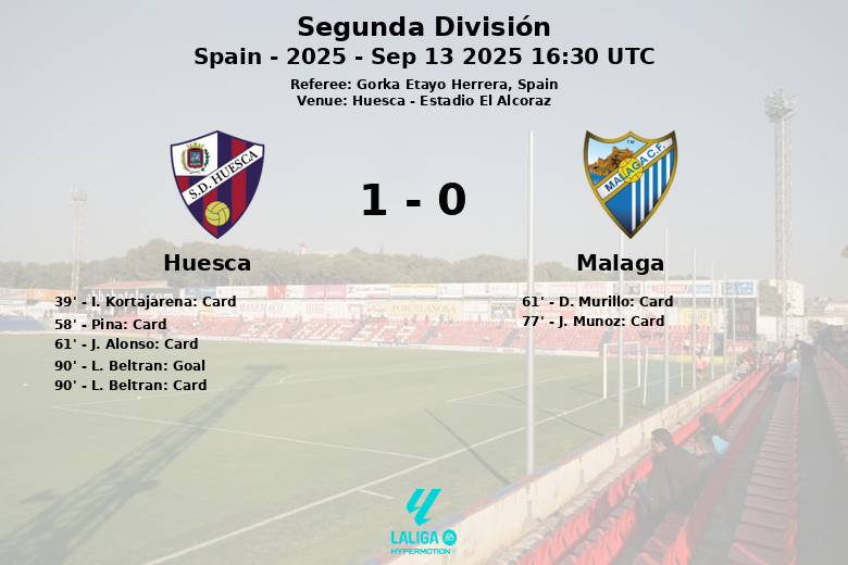 Huesca, Spain – In a hard-fought match at the Estadio El Alcoraz, Huesca secured a dramatic victory against Malaga in the fifth matchday of the Segunda División. The encounter, officiated by Gorka Etayo Herrera, was marked by its intensity and constant interruptions, reflected in the multiple yellow cards shown to both teams. Huesca slightly dominated possession with 48% compared to Malaga’s 52%, but both teams struggled to convert their goalscoring opportunities. Huesca took 10 shots, only 2 of which were on target, while Malaga attempted 7 shots, with 3 directed at the goal. The tension was palpable throughout the match, with numerous fouls committed by both sides. Just when everything seemed to point to a goalless draw, L. Beltran appeared in the 90th minute to score the winning goal for Huesca, unleashing euphoria in the stands. Beltran, ironically, was cautioned with a yellow card immediately after his goal.