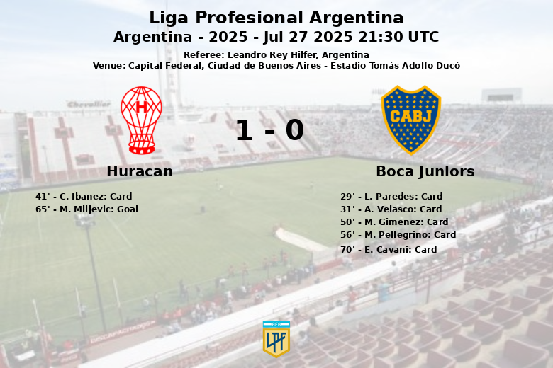 Capital Federal, City of Buenos Aires – In a hard-fought match at the Estadio Tomás Adolfo Ducó, Huracán defeated Boca Juniors on matchday 3 of the Liga Profesional Argentina. The encounter, officiated by Leandro Rey Hilfer, was characterized by a congested midfield and a high number of cautions.