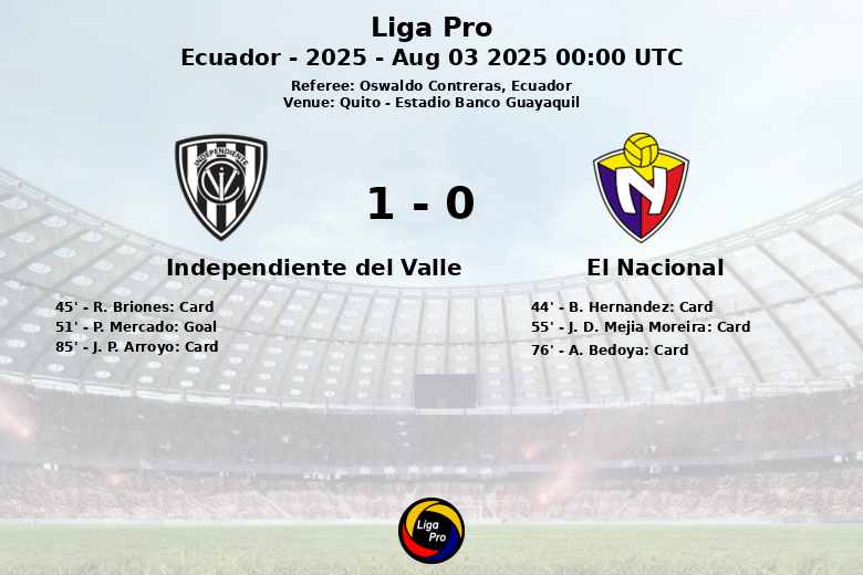 In the second half, Independiente del Valle managed to break the tie thanks to a goal by P. Mercado in the 51st minute. The goal gave confidence to the visitors, who continued to control the pace of the match. El Nacional, despite some attempts, failed to convert their opportunities. The match continued at a similar pace, with yellow cards added for J. D. Mejia Moreira and A. Bedoya on the side of El Nacional, and J. P. Arroyo for Independiente del Valle, reflecting the constant dispute for control of the midfield.