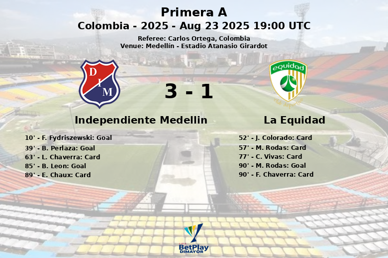 Medellín, Colombia – Independiente Medellín convincingly defeated La Equidad in a match played at the Estadio Atanasio Girardot. The home team dominated possession with 69% and created numerous scoring opportunities, converting three of them. F. Fydriszewski opened the scoring in the 10th minute, assisted by F. Chaverra, who also provided an assist for B. Perlaza’s goal in the 39th minute. In the second half, B. Leon sealed the victory with a goal in the 85th minute.