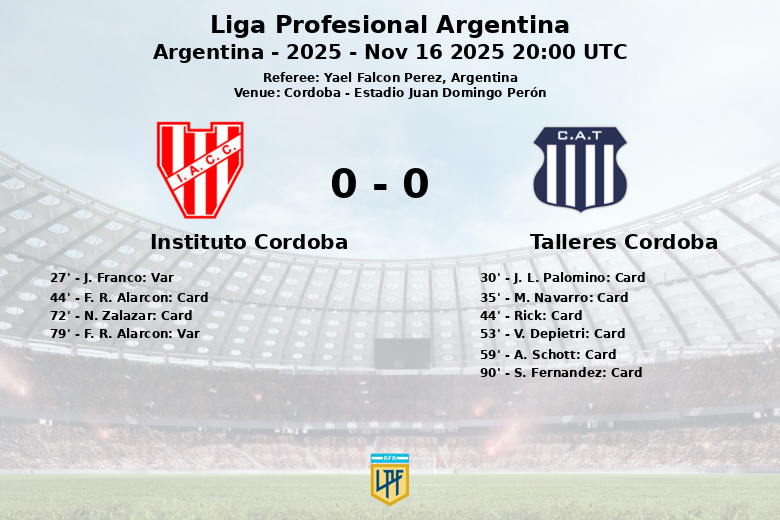 Talleres Cordoba dominated possession with 62%, but only managed to generate 8 shots, of which 2 were on target. The game was constantly interrupted by fouls, with a total of 17 committed by Talleres and 14 by Instituto. The intensity of the match was also reflected in the cards, with five yellow cards for Talleres and two for Instituto.