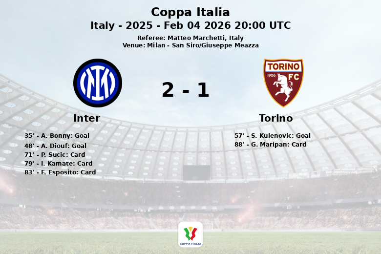 Torino responded in the 57th minute with a goal by S. Kulenovic, but it was not enough to change the course of the match. Despite generating a similar number of shots (11 for Torino versus 10 for Inter), Inter’s effectiveness was key. Both teams had 2 corners. The match was characterized by high intensity, with 11 fouls committed by Inter and 12 by Torino. Referee Matteo Marchetti showed 3 yellow cards to Inter (P. Sucic, I. Kamate, and F. Esposito) and 1 to Torino (G. Maripan). Inter thus advances to the semi-finals of the Coppa Italia.