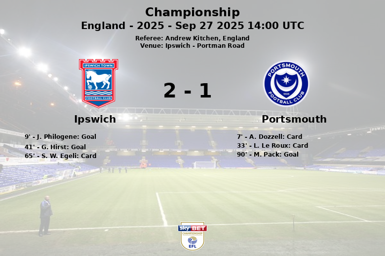 Portsmouth managed to pull one back in the 90th minute thanks to a goal from M. Pack, assisted by J. Swift, but it was too late to change the course of the match. Ipswich finished with 49% possession, 13 shots (5 on target) and 5 corners, while Portsmouth recorded 6 shots (3 on target) and 3 corners. Referee Andrew Kitchen showed 3 yellow cards in total.