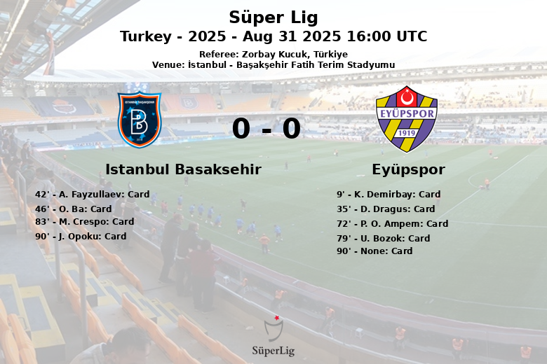 Istanbul, Turkey – A tense and closely contested match at the Başakşehir Fatih Terim Stadium culminated in a goalless draw between Istanbul Basaksehir and Eyüpspor, in a game corresponding to the fourth matchday of the Süper Lig. The match, refereed by Zorbay Kucuk, was characterized by a high number of cautions and tight tactical play.