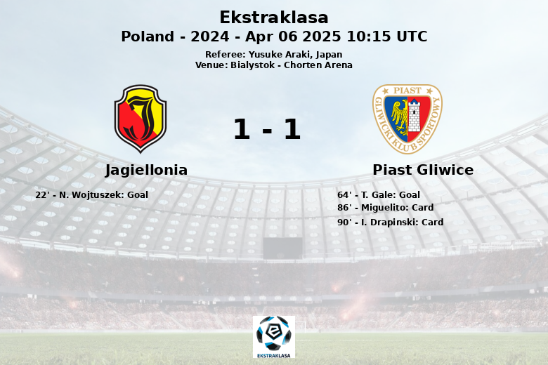 Jagiellonia Białystok and Piast Gliwice played out a thrilling 2-2 draw at the Chorten Arena in Białystok on April 6th, 2025, in the 27th round of the Polish Ekstraklasa. The match, officiated by Yusuke Araki from Japan, was a back-and-forth affair. Jagiellonia took an early lead, scoring in the 22nd minute through N. Wojtuszek, assisted by J. Imaz. Piast Gliwice fought back in the second half, equalizing in the 64th minute with a goal from T. Gale. The game ended 2-2, with both teams scoring one goal each in the second half. Jagiellonia enjoyed more possession (56%), registering 12 shots (3 on target), while Piast Gliwice, despite having less possession (44%), managed 13 shots (4 on target). Piast Gliwice finished the game with two yellow cards, while Jagiellonia received none. The match was characterized by its intensity, with a total of 20 fouls.