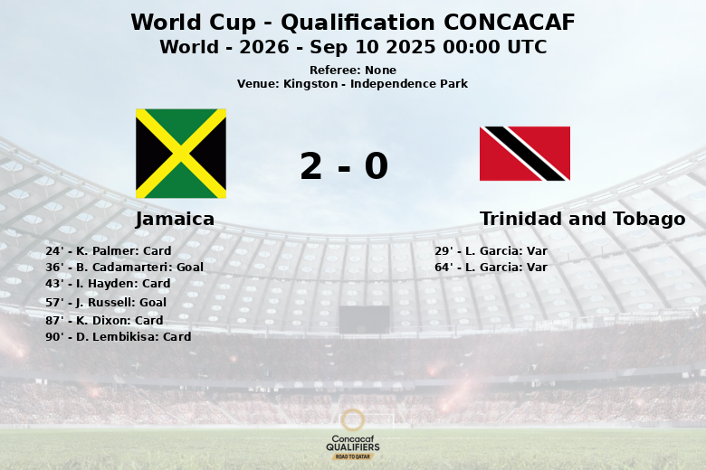 In the second half, Jamaica extended their lead with a goal from J. Russell in the 57th minute. Trinidad and Tobago, again, had a goal disallowed for offside by L. Garcia, aided once more by VAR, in the 64th minute. The remainder of the match was characterized by a series of yellow cards for Jamaica (K. Dixon in the 87th and D. Lembikisa in the 90th) and a desperate attempt by Trinidad and Tobago to close the gap.