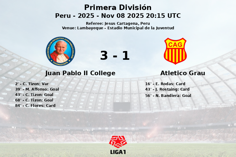 Despite Atlético Grau dominating possession with 70%, Juan Pablo II College took the lead. Initially, a goal by C. Tizon was disallowed by VAR in the 2nd minute due to offside. However, M. Affonso opened the scoring from the penalty spot in the 39th minute. Shortly after, in the 43rd minute, C. Tizon extended the lead, assisted by Affonso, consolidating a favorable first half.