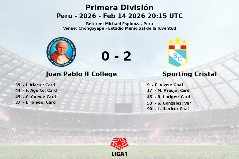 The first goal came early, in the 9th minute, thanks to F. Vizeu, who opened the scoring for Sporting Cristal. Juan Pablo II College was diminished at the end of the first half with the expulsion of F. Agurto in the 44th minute. Despite playing with ten men for most of the second half, the team tried to contain the rival attack, but Sporting Cristal managed to extend their lead in the 90th minute with a goal by L. Iberico, assisted by Y. Yotun. A goal by S. Gonzalez of Sporting Cristal was disallowed by VAR due to offside. The referee of the match, Michael Espinoza, showed several yellow cards and one red card, reflecting the intensity of the game.