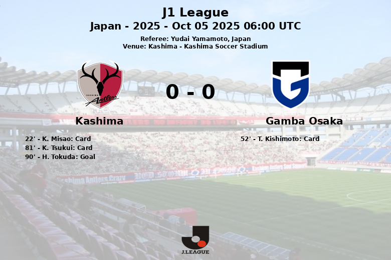 The first half passed without goals, although with intensity and a yellow card for K. Misao of Kashima. In the second half, the game became tougher, and T. Kishimoto of Gamba Osaka also received a yellow card.