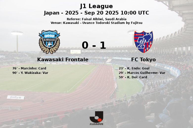 FC Tokyo appeared to take the lead in the 23rd minute with a goal by K. Endo, assisted by M. Nagakura, but the joy was short-lived. In the 29th minute, a goal by Marcos Guilherme was disallowed after VAR review for offside. Kawasaki Frontale, despite dominating possession with 58%, failed to capitalize on their ball control into clear goal-scoring opportunities.