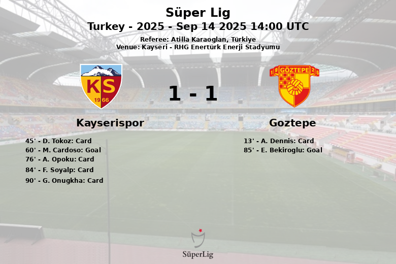 The first half passed without goals, but with yellow cards for A. Dennis of Goztepe in the 13th minute and for D. Tokoz of Kayserispor just before halftime. Kayserispor took the lead in the 60th minute with a goal from M. Cardoso after an assist from L. Benes. However, Goztepe reacted and equalized in the 85th minute with a goal from E. Bekiroglu.