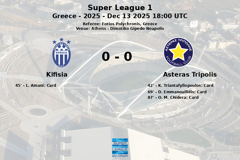 Asteras Tripolis, although with less possession (37%), tried to capitalize on their opportunities, generating 9 shots, with 3 requiring the intervention of the rival goalkeeper. The match was interrupted by numerous fouls, 17 committed by Kifisia and 10 by Asteras Tripolis, resulting in one yellow card for Kifisia and three for Asteras Tripolis. Referee Fotios Polychronis had a busy day in matchday 14 of Super League 1. Both teams sought a goal through aerial play, with Kifisia earning 6 corner kicks and Asteras Tripolis 4. The match, corresponding to the 2025 season, left a bittersweet taste for Kifisia, who must improve their effectiveness in front of goal if they wish to turn their dominance into victories.