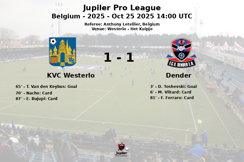 Westerlo, Belgium – In a closely contested match at Het Kuipje, KVC Westerlo and Dender played to a draw in a game marked by intensity and cautions. Dender surprised early with a goal from D. Toshevski in the 3rd minute, assisted by M. Sambu. However, KVC Westerlo, dominating possession with 62%, managed to equalize in the 65th minute thanks to a goal from T. Van den Keybus, assisted by I. Sakamoto. The match, officiated by Anthony Letellier, was characterized by physical play, reflected in the numerous fouls (16 for Dender and 12 for Westerlo) and yellow cards shown to M. Viltard (Dender), Nacho (KVC Westerlo), F. Ferraro (Dender), and E. Bujupi (KVC Westerlo). Although Westerlo generated a higher volume of offensive play with 23 total shots (6 on target and 9 off target) and 11 corners, Dender remained solid in defense. The match ended with the score level, leaving both teams with one point in this matchday 12 of the Jupiler Pro League regular season.