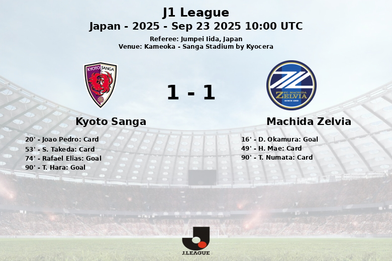 The match was punctuated by several yellow cards, two for each team: Joao Pedro and S. Takeda for Kyoto Sanga, and H. Mae and T. Numata for Machida Zelvia.