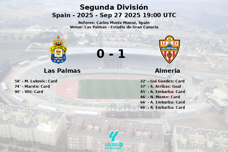 Las Palmas, Spain – In a hard-fought match at the Estadio de Gran Canaria, Almeria triumphed over Las Palmas with a final score of 1-0. The game, part of the seventh matchday of the Segunda División, was marked by intensity and controversy, with a total of six yellow cards and two red cards distributed between both teams.