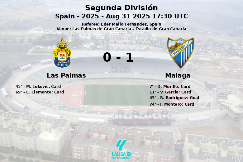 The game was also intense in terms of fouls, with 16 committed by Málaga and 7 by Las Palmas. The referee showed a total of five yellow cards, three to Málaga players (Murillo, V. García and Montero) and two to Las Palmas players (Lukovic and Clemente). Despite the dominance in possession and offensive attempts, Las Palmas failed to convert their chances and Málaga took the three points from Gran Canaria.