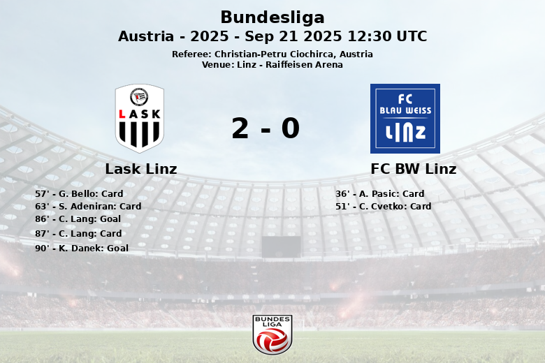 It was in the final minutes of the match that LASK Linz managed to break the tie. First, C. Lang, assisted by M. Cisse, opened the scoring in the 86th minute. Shortly after, in the 90th minute, K. Danek sealed the match with a second goal.