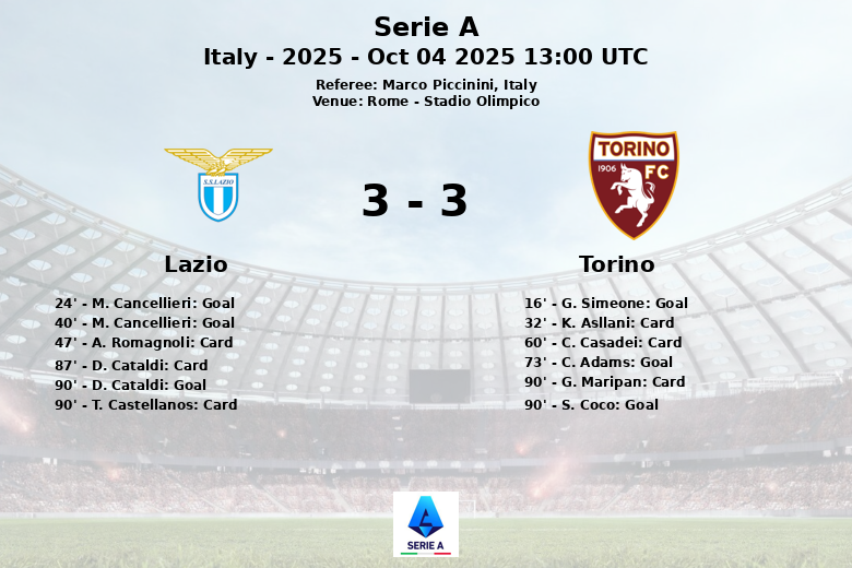 The second half continued in the same vein. Torino managed to equalize thanks to a goal by C. Adams in the 73rd minute, assisted by N. Nkounkou, demonstrating a great ability to react. The end of the match was chaotic. In the 90th minute, D. Cataldi scored a penalty for Lazio, and S. Coco, without assistance, scored for Torino, establishing the final draw.