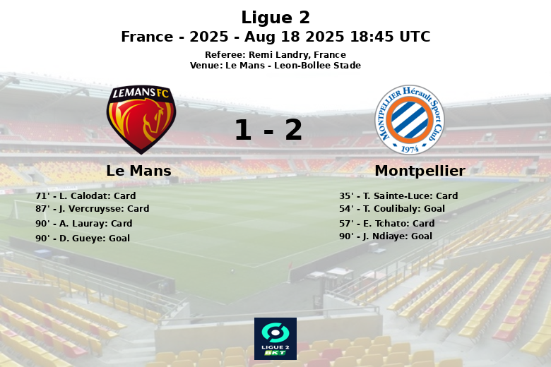 Le Mans, with a game that accumulated five corners, sought the equalizer with insistence. In the final minutes, when the game seemed settled, D. Gueye, assisted by B. Oggad, equalized for Le Mans in the 90th minute. The local joy, however, was short-lived. Immediately afterwards, J. Ndiaye, assisted by A. Mendy, put Montpellier back in the lead.