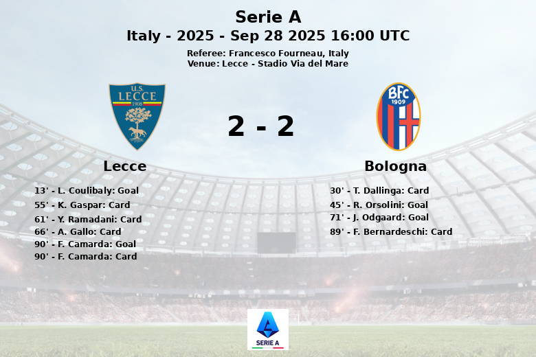 In the second half, Bologna took the lead with a goal from J. Odgaard in the 71st minute, assisted by E. Holm, a result of their insistent pressure and ball control. Just when it seemed that victory was going to Bologna, Lecce resurged in the final minutes of the match. F. Camarda scored a crucial goal in the 90th minute, rescuing a valuable point for his team and unleashing joy among the local fans. The match was marked by high intensity, reflected in the numerous fouls (13 per team) and yellow cards shown by referee Francesco Fourneau.