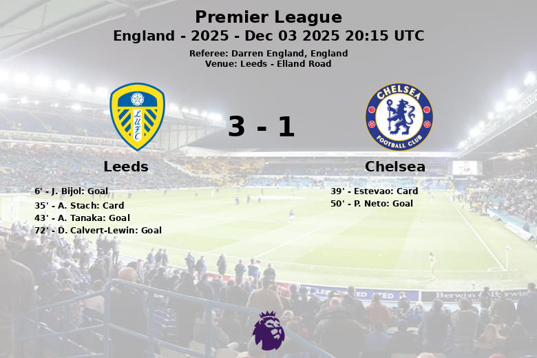 The match began with a charged-up Leeds side. J. Bijol opened the scoring in the 6th minute, assisted by A. Stach, unleashing euphoria in the stands. The intensity of the game remained high, and A. Stach received a yellow card in the 35th minute. Shortly after, Chelsea’s Estevao was also cautioned in the 39th minute. Before halftime, A. Tanaka extended Leeds’ lead in the 43rd minute, after an assist from J. Bogle, leaving Chelsea needing to mount a comeback in the second half.