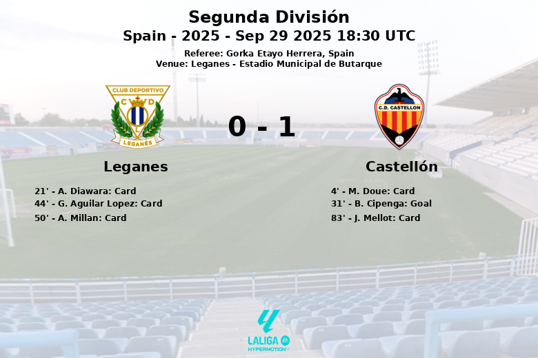 Leganés, Spain – In a hard-fought match at the Estadio Municipal de Butarque, Castellón secured a valuable victory against Leganés, thanks to a goal by B. Cipenga in the 31st minute. Despite Leganés’ territorial dominance, holding 57% of possession, they failed to convert their chances, evidenced by their zero shots on target out of a total of six attempts. The match was characterized by high intensity and numerous fouls, with 19 committed by Castellón and 18 by Leganés. The referee, Gorka Etayo Herrera, issued a total of six yellow cards, four to Leganés (A. Diawara, G. Aguilar Lopez, A. Millan) and two to Castellón (M. Doue, J. Mellot). Castellón, with 43% possession, capitalized on one of their limited opportunities in front of the opponent’s goal.