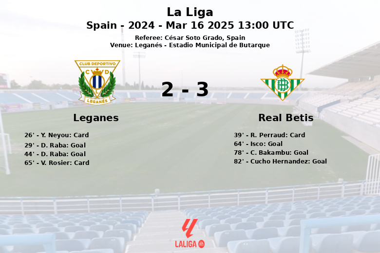 Leganés suffered a resounding defeat against Real Betis at the Estadio Municipal de Butarque, with a final score of 2-4. The match, corresponding to matchday 28 of La Liga, was played on March 16, 2025. Despite opening the scoring with two goals from D. Raba (minutes 29′ and 44′), Leganés could not contain Real Betis’ push in the second half. Isco scored a penalty (64′), followed by goals from C. Bakambu (78′) and Cucho Hernández (82′). Real Betis dominated possession (65%) and created more goal-scoring opportunities (21 shots to Leganés’ 10). Leganés received two yellow cards, while Real Betis received only one. Despite the initial advantage, Betis’ greater effectiveness in the second half secured the victory for the visitors.