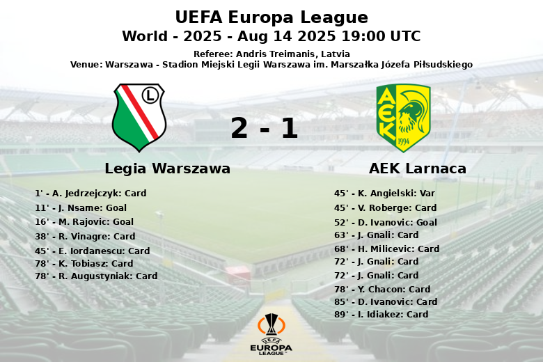 Warsaw witnessed a vibrant and controversial encounter between Legia Warszawa and AEK Larnaca, in the third qualifying round of the UEFA Europa League. Legia secured the victory with a strong offensive performance in the first half. J. Nsame opened the scoring in the 11th minute, assisted by P. Wszolek, and M. Rajovic extended the lead in the 16th minute, assisted by V. Bichakhchyan.