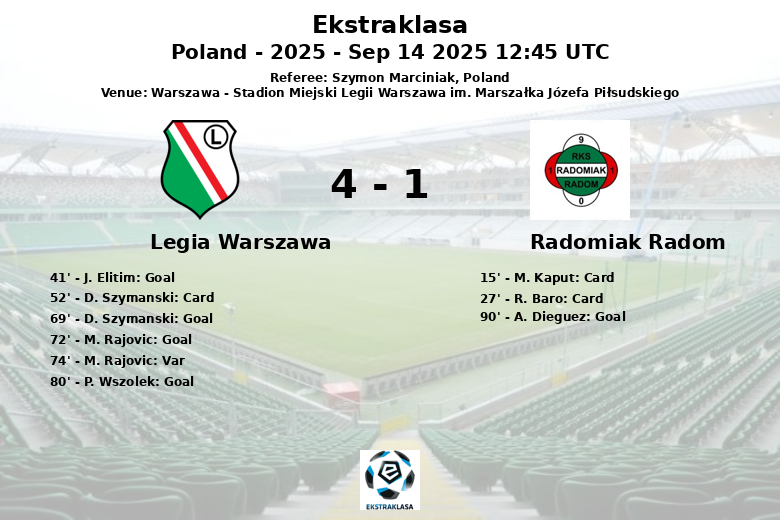 The second half saw Legia Warszawa take control of the match. D. Szymanski extended the lead in the 69th minute, again with an assist from J. Elitim, and shortly after, M. Rajovic seemed to seal the match in the 72nd minute, although his goal was disallowed by VAR due to an offside. P. Wszolek converted a penalty in the 80th minute for Legia. Radomiak Radom managed to pull one back in stoppage time thanks to a goal from A. Dieguez, assisted by I. Camara.