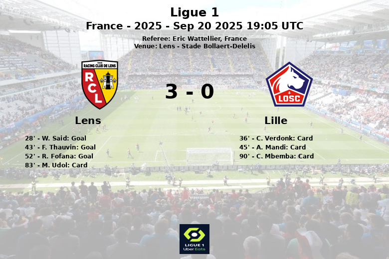 The score was opened in the 28th minute with a goal from W. Said, who took advantage of a defensive error by Lille to put his team ahead. Before the end of the first half, F. Thauvin extended Lens’ lead in the 43rd minute, with an excellent assist from Said, consolidating the home side’s dominance.