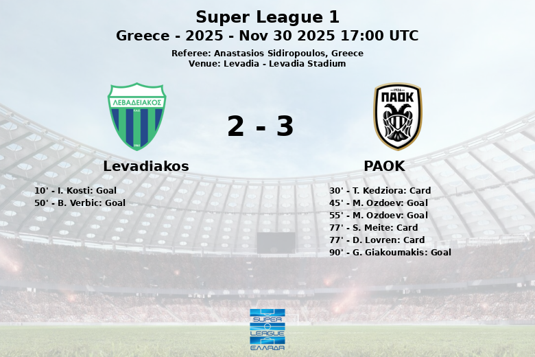 Levadiakos took an early lead with a goal by I. Kosti in the 10th minute, surprising the PAOK defense. However, the visiting team reacted and managed to equalize just before halftime thanks to a goal by M. Ozdoev in the 45th minute, assisted by L. Ivanusec.