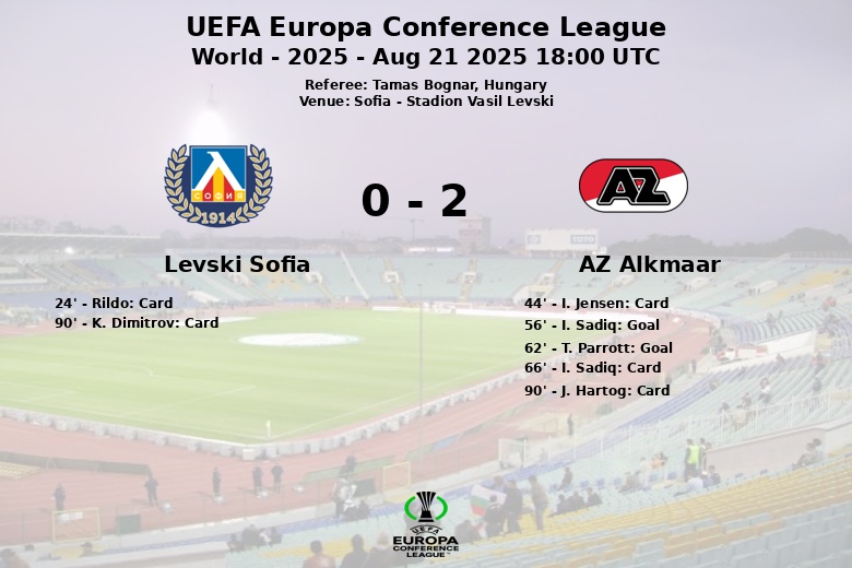 The second half was where the match was decided. I. Sadiq opened the scoring for AZ Alkmaar in the 56th minute, assisted by I. Jensen. T. Parrott extended the lead for the visiting team in the 62nd minute. Levski Sofia, despite their efforts, failed to reduce the deficit. I. Sadiq also received a yellow card in the 66th minute. The match concluded with yellow cards for K. Dimitrov of Levski Sofia and J. Hartog of AZ Alkmaar in the 90th minute.