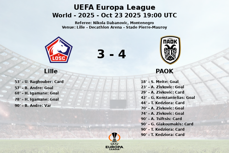 PAOK surprised early on with a goal by S. Meite in the 18th minute, assisted by A. Zivkovic, quickly followed by another goal from A. Zivkovic in the 23rd minute with an assist from G. Michailidis. G. Konstantelias extended the lead in the 42nd minute, assisted by F. Chalov. However, Lille did not give up and reduced the deficit with a goal from B. Andre in the 57th minute, assisted by C. Verdonk. PAOK responded quickly and A. Zivkovic, who had missed a penalty in the 70th minute, redeemed himself by scoring a goal in the 74th minute, assisted by K. Despodov. H. Igamane scored again for Lille with goals in the 68th and 78th minutes, the first assisted by T. Meunier and the second by C. Mbemba.