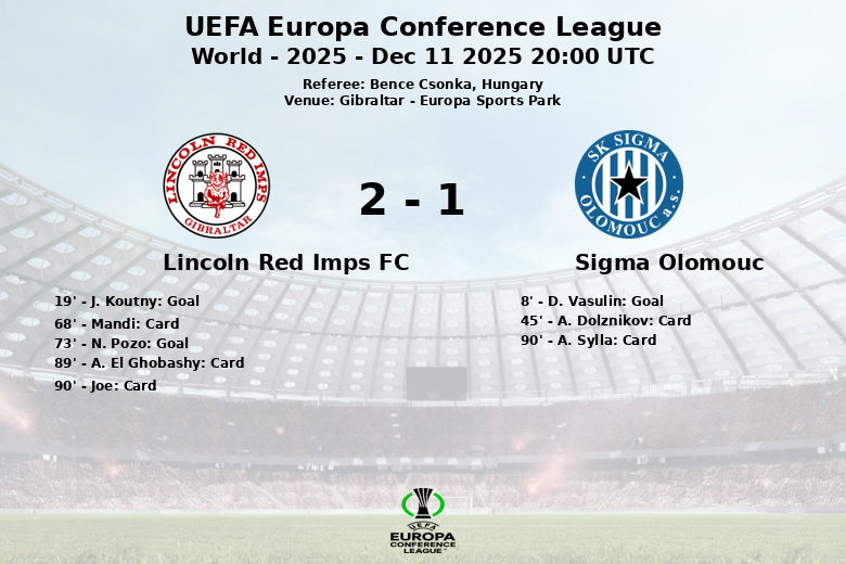 Sigma Olomouc opened the scoring early at minute 8 with a goal by D. Vasulin, assisted by R. Breite. However, Lincoln Red Imps FC responded with an own goal by J. Koutny at minute 19, following an assist from B. Lopes, thus leveling the score. Later in the second half, N. Pozo scored the winning goal for Lincoln Red Imps FC at minute 73, with an assist from Joe, sealing the final result.