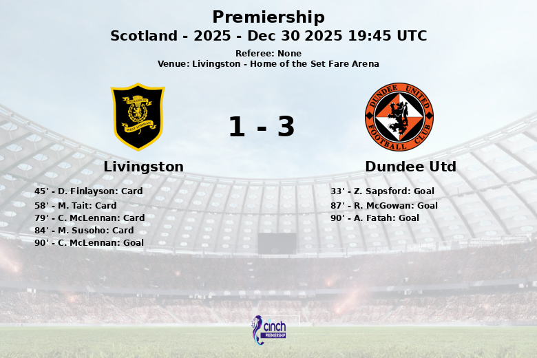 The second half was intense, marked by several yellow cards for Livingston players. However, in the final minutes, the game became frenetic. An own goal by R. McGowan in the 87th minute gave Livingston the equalizer. It seemed Dundee Utd would take the victory in the 90th minute with a goal by A. Fatah, but Livingston responded immediately with a goal by C. McLennan in the same minute, securing a dramatic draw.