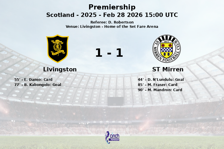 ST Mirren took the lead just before halftime, in the 44th minute, when D. N’Lundulu, assisted by M. Mandron, managed to beat the home goalkeeper. However, Livingston did not give up and, after a period of constant pressure, found the equalizer in the 77th minute thanks to B. Kabongolo, who capitalized on an assist from B. McKay to level the score.