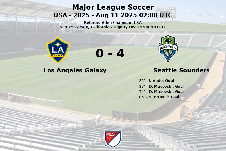 The score was opened in the 25th minute with an own goal by J. Aude, following an offensive play by Seattle. D. Musovski extended the lead for the Sounders in the 37th minute, and repeated in the 54th minute to make it 3-0. Despite having 54% possession, the Los Angeles Galaxy struggled to create clear scoring opportunities, registering only three shots on goal compared to Seattle’s seven. The Galaxy’s defense was constantly pressured by the Sounders’ relentless attack. S. Brunell sealed the victory for Seattle with a goal in the 85th minute.