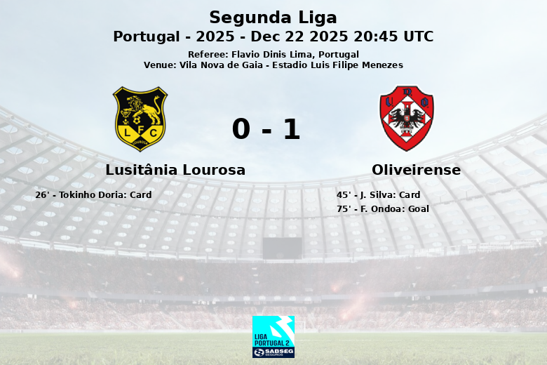 Vila Nova de Gaia, December 22, 2025 – In a hard-fought match at the Estadio Luis Filipe Menezes, Oliveirense defeated Lusitânia Lourosa in a game marked by tension and discipline. Referee Flavio Dinis Lima (Portugal) had a busy night in this match of the 15th round of the Portuguese Segunda Liga.