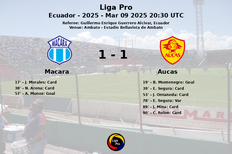 Macará and Aucas played a thrilling match at the Estadio Bellavista de Ambato, corresponding to the fourth round of the 2025 Liga Pro regular season. The match, played on March 9th at 8:30 PM, ended in a 1-1 draw. Aucas took the lead at the 19th minute with a goal by B. Montenegro, while Macará equalized at the 57th minute thanks to A. Muñoz. The game was characterized by tension, with a total of 7 yellow cards, 2 for Macará and 5 for Aucas. Aucas had a goal disallowed by VAR in the 78th minute. Both teams showed similar possession, with Macará slightly ahead (51%), and a similar number of shots on goal. Despite the alternating dominance, the final result reflected a close and hard-fought match.