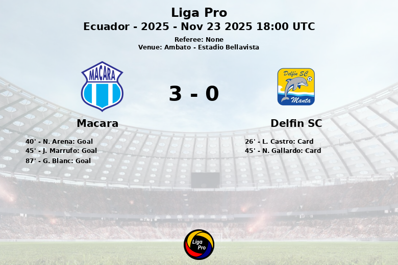 In the second half, Macará maintained control of the game and sealed the victory with a goal by G. Blanc in the 87th minute, assisted by J. Morales. Delfín SC, playing with one man down, struggled to create danger and only managed 7 shots, only 2 of which were on target.