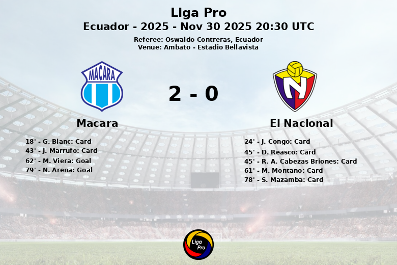 The game became complicated for El Nacional from the 24th minute, when J. Congo received a red card, forcing the team to play with ten men for a large part of the match. Macará’s pressure intensified in the second half, bearing fruit with goals from M. Viera in the 62nd minute and N. Arena in the 79th minute, sealing the victory for the home team.